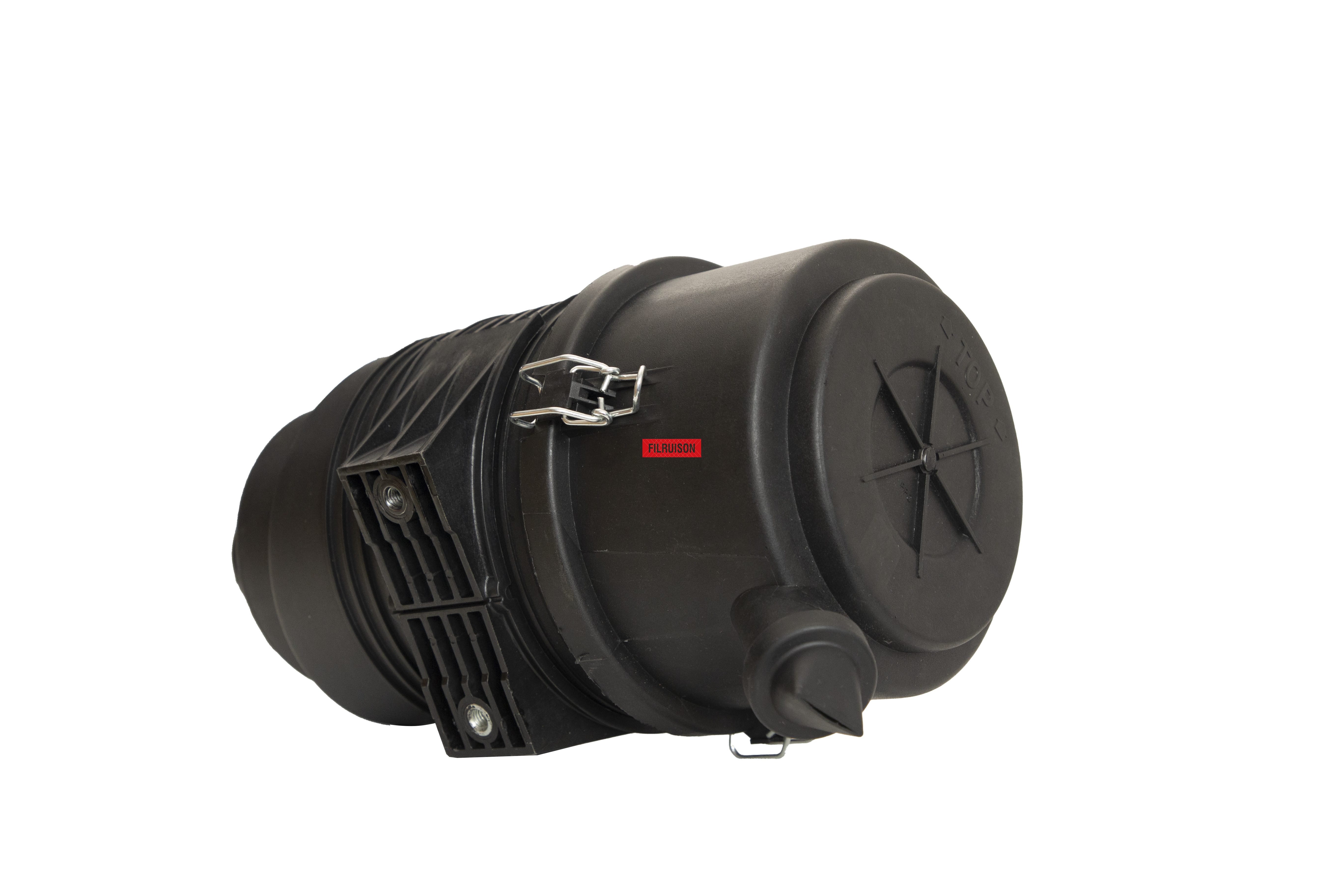 Air flows in housing to spin. Centrifugal force separates the heaviest impurities from the air stream. These contaminants are discharged through an integral evacuator valve. Only purified air flows to the air filter elements (primary and safety stages of filtration). These elements retain the 99.99% of the contaminants which were not eliminated in the first stage. Then clean air flows to the engine or air compressor.